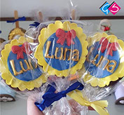 • Biscoito no palito embrulhado no saquinho celofane e fita de cetim com decoração 2D